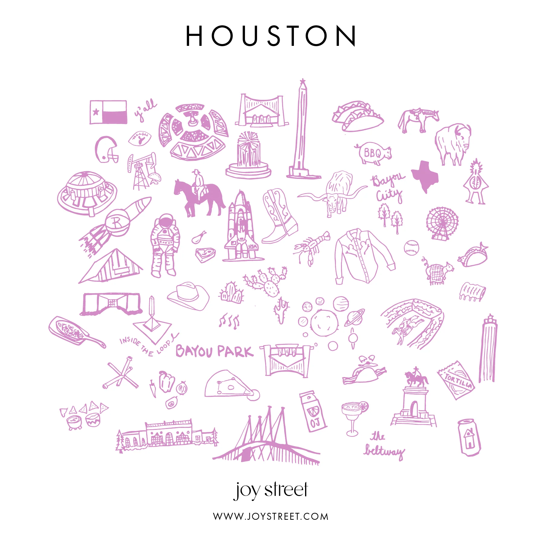 Howdy y'all! Explore Joy Street Kids Houston pajamas, hand drawn by our founder Eliza. From the Bayou City to BBQ & Longhorns and Livestock shows to the Space Center, there is one thing we know for sure, WE LOVE HOUSTON. This Texas print will fill you and your little with all of the nostalgia and yee-haw's that Houston has to offer! Bless your heart and sleep tight in our Houston pajamas.